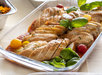 Pechugas de pollo con salsa pesto, tomates rostizados y mozzarella.