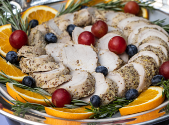 Pechugas de pollo envueltas en prosciutto aromatizadas en salsa ligera con mantequilla y vino blanco.